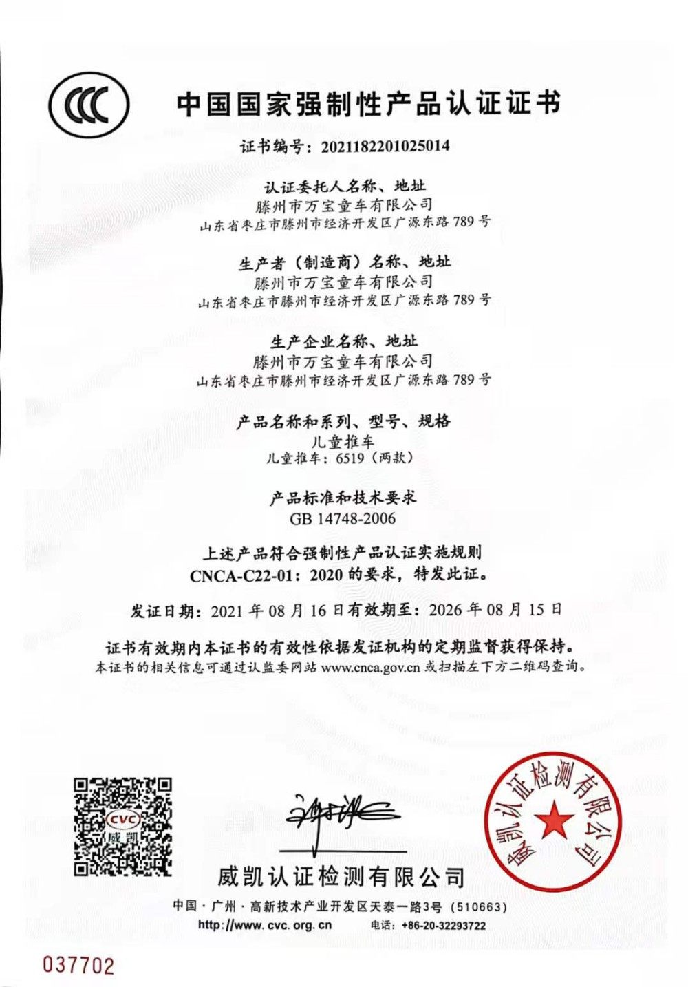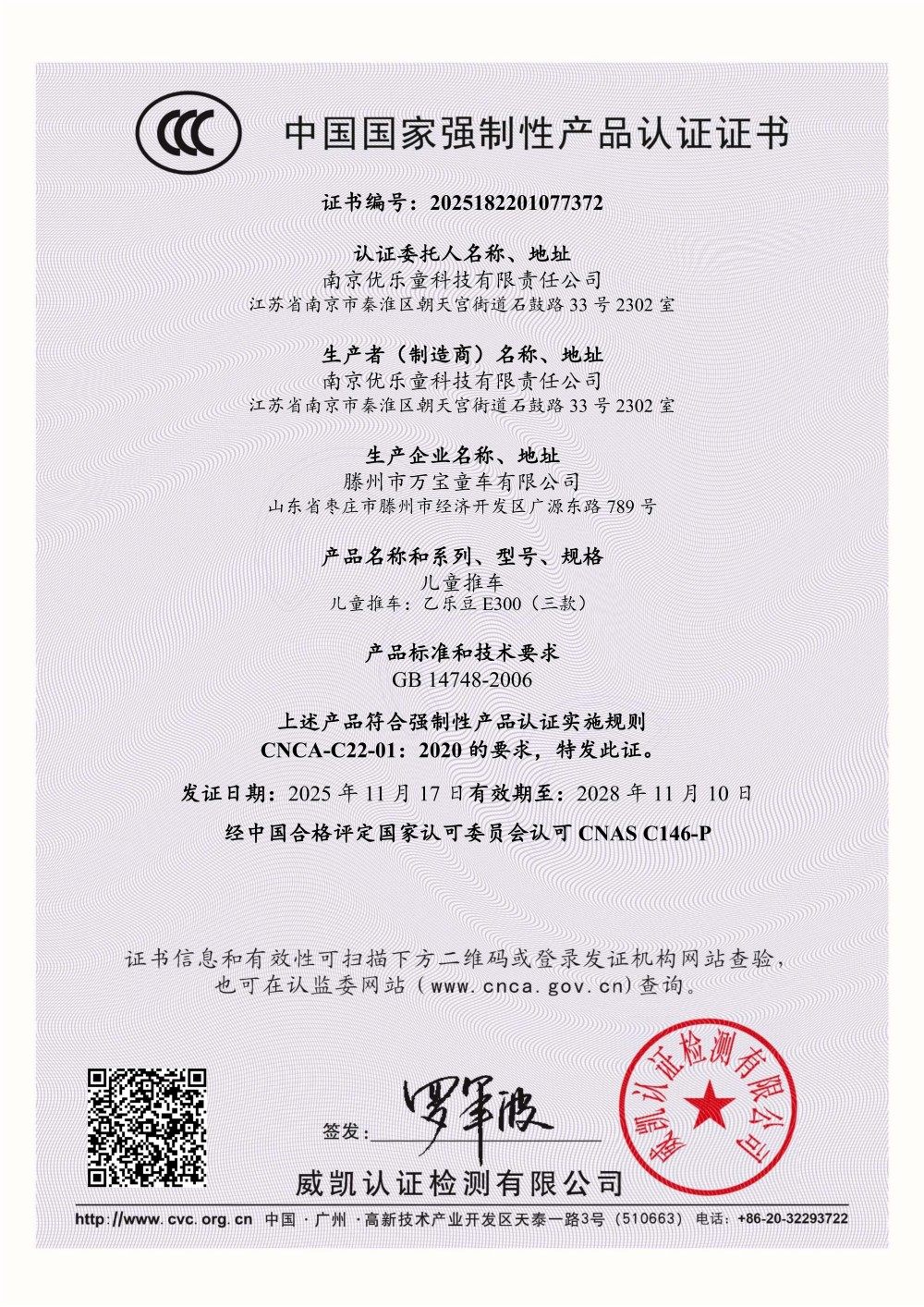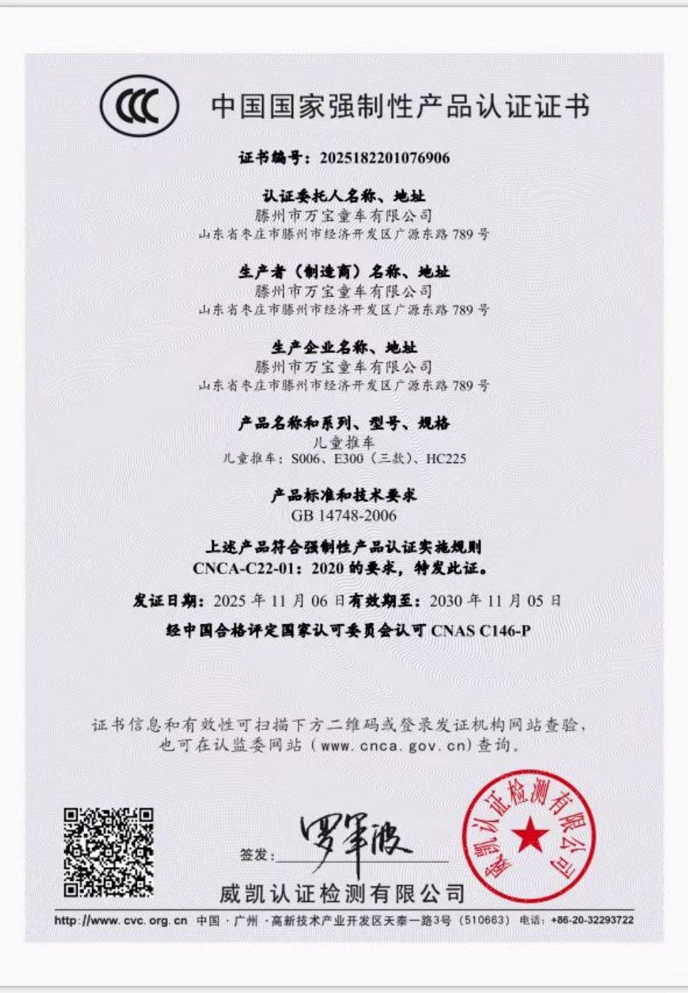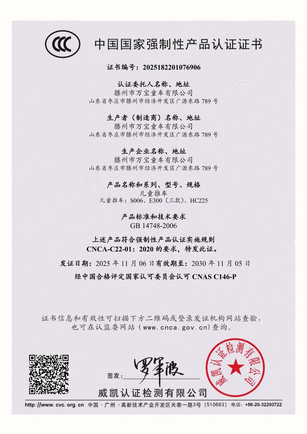 لقد اجتازت منتجاتنا شهادات صارمة تشمل CCC, وISO, وEU EN1888-1, وUS ASTM F833. ومن خلال الفحوصات الصارمة بدءًا من اختيار المواد وحتى الحرفية, نوفر تجربة تنقل آمنة ومطمئنة للأطفال.